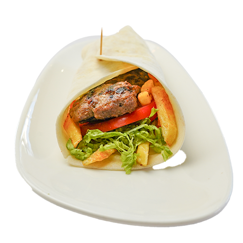Lavash bread, lettuce, tomato, chips, grilled meatballs