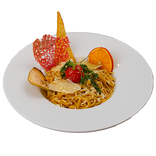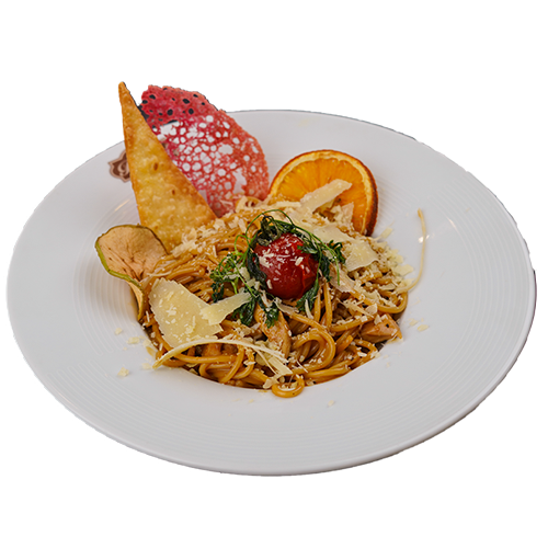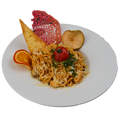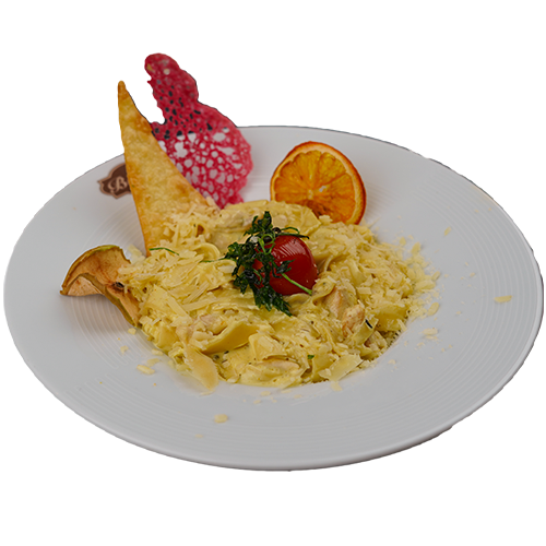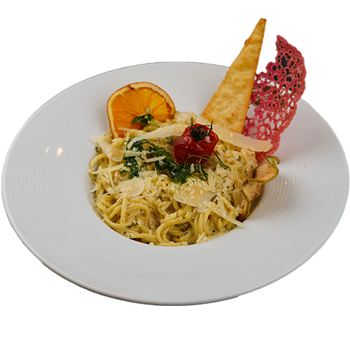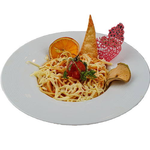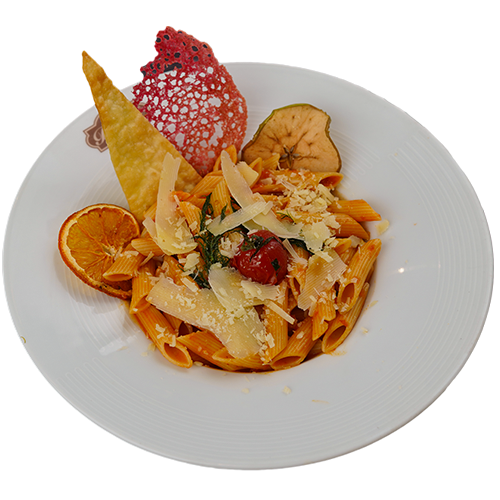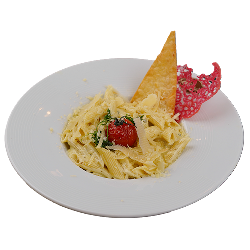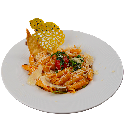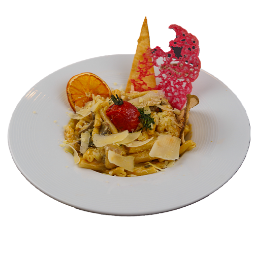 Casarecca pasta, mushrooms, cream, hot sauce, pesto sauce, Parmesan cheese