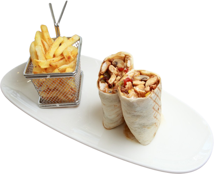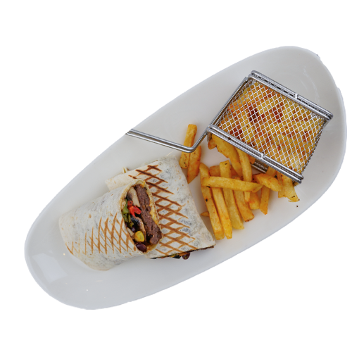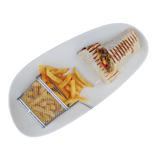 tortilla bread wrapped sautéed meat, green and red peppers, mushrooms, corn, soy sauce, served with French fries